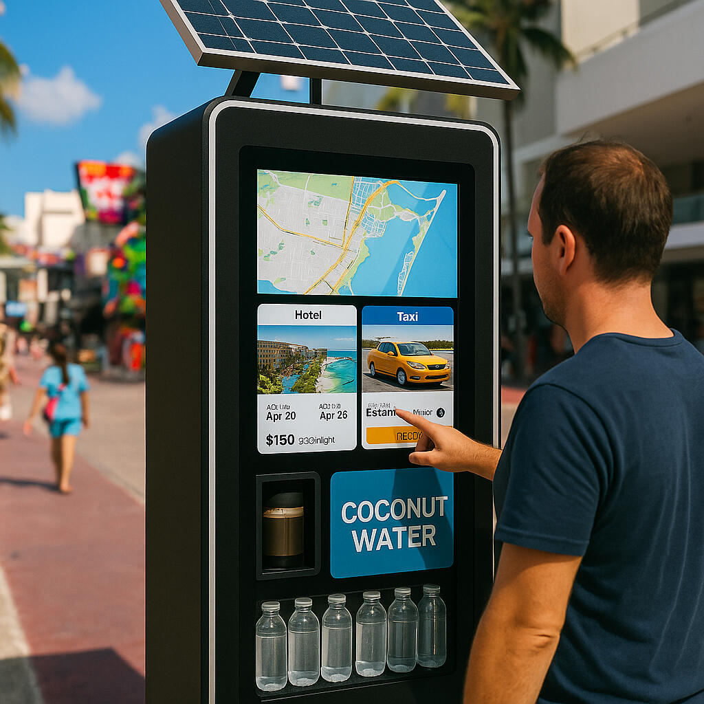 Compra de entradas a eventos y conciertosRenta de autos desde el kioskoDescuentos para turistas con código QRServicios Complementarios y MonetizaciónPagos de servicios públicos: luz, agua, IBI, multas, tasas municipales.Recargas móviles: Vodafone, Orange, DIGI, Lycamobile, etc.Sistema de puntos y fidelización: comercios locales ofrecen descuentos por reservar desde el kiosko o la app móvil conectada.Publicidad inteligente: pantalla de espera muestra promociones locales o institucionales.Dashboard para el Ayuntamiento o DBUS: acceso a estadísticas reales de uso, idioma, zonas de interés, etc.