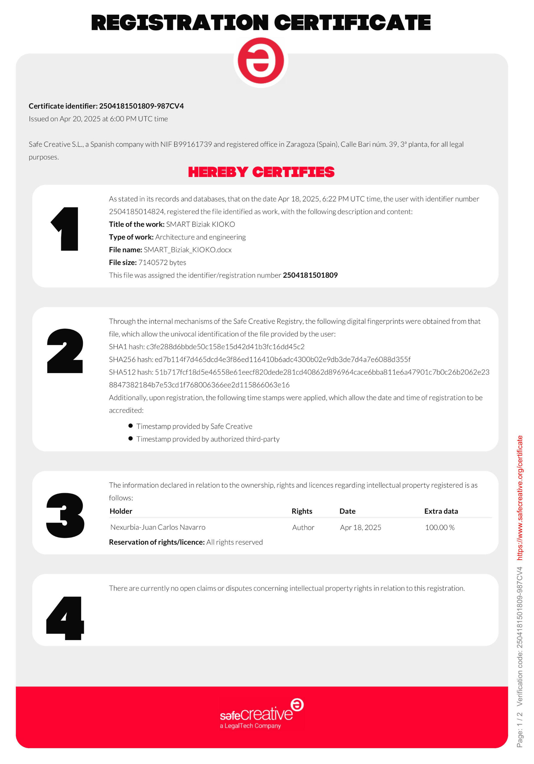 Como parte del compromiso de innovación urbana, el diseño del kiosko inteligente SMART BIZIAK ha sido registrado oficialmente como obra original bajo los derechos de propiedad intelectual.Este registro garantiza que el diseño exterior, la distribución funcional de sus módulos internos, y el sistema de interacción inteligente (pantalla, sensores, sistema solar) son propiedad exclusiva del proyecto Nexurbia, protegiendo así su uso, réplica o modificación sin autorización.¿Qué incluye el Certificado de Autor?