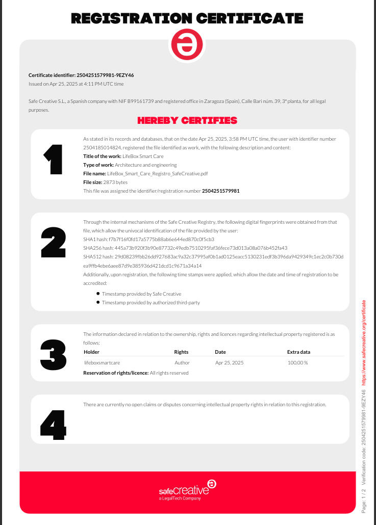 LifeBox Smart Care es un proyecto registrado oficialmente como obra de innovación tecnológica e industrial en la plataforma Safe Creative, garantizando así su originalidad, autoría y protección legal.El diseño, concepto funcional, arquitectura operativa y documentación técnica han sido certificados y depositados bajo registro digital, como parte del compromiso de Nexurbia con el desarrollo responsable de soluciones urbanas sostenibles.📄 Número de Registro Safe Creative: 2504251579981-9EZY46